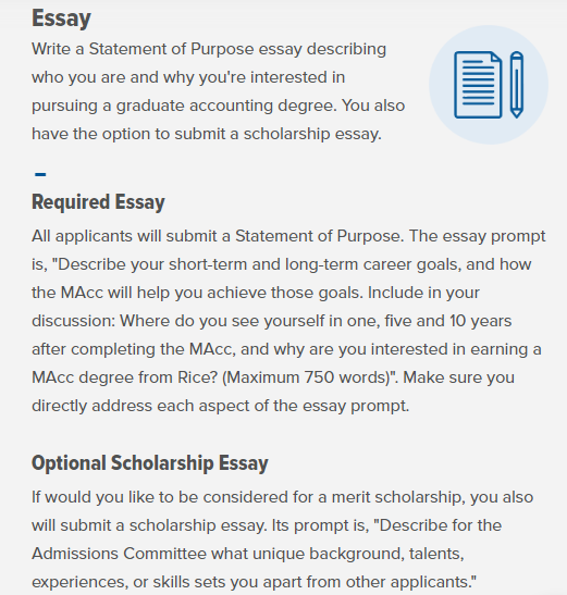 申友留学发现,莱斯大学会计硕士项目申请者需要缴纳申请费75美元,需要提供简历、成绩单、2封专业推荐信和陈述自己为何选择该项目的Essay,如果要申请奖学金,另外需要提交申请奖学金的Essay。