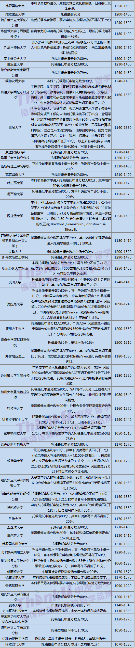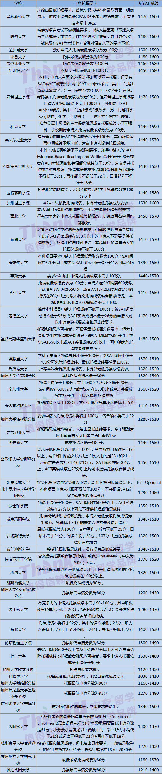2018年美国名校top100托福/sat成绩要求