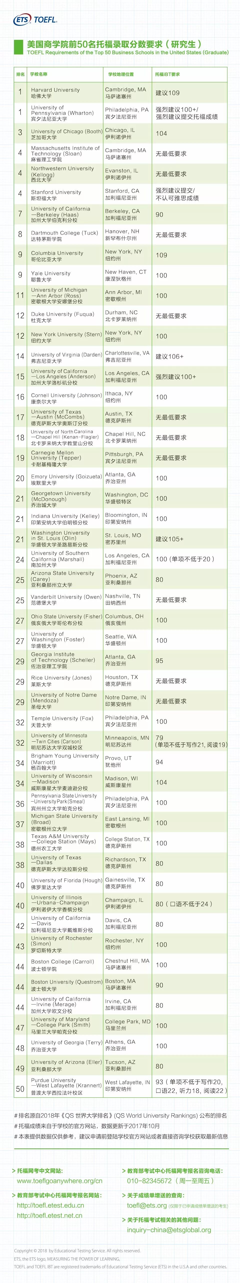 接下来是美国TOP50商学院和工程学院的研究生托福分数要求,需要的同学记得收藏。